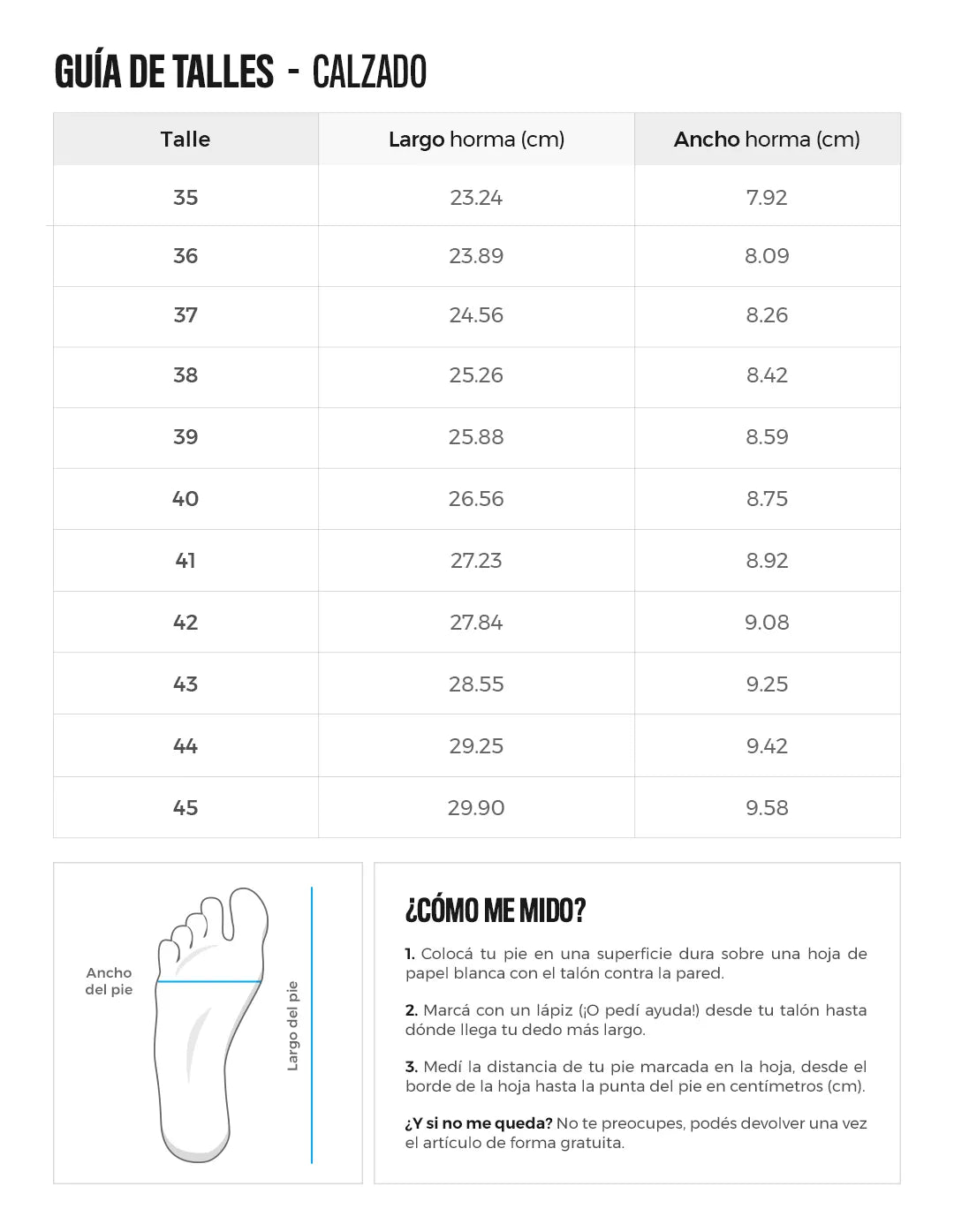 Vas a poder hacer cambios si el talle no te queda o el producto no te gusta ¡El primer cambio es gratis!. Los costos de retiro y reenvío del nuevo par estarán a cargo nuestro. Tené en cuenta que no deben haber pasado más de 30 días desde que recibiste el producto y que tenés que devolverlo en perfectas condiciones, sin signos de uso y en su caja original, también en buen estado. De todas formas te recomendamos consultar las guías de talles que están en cada producto.